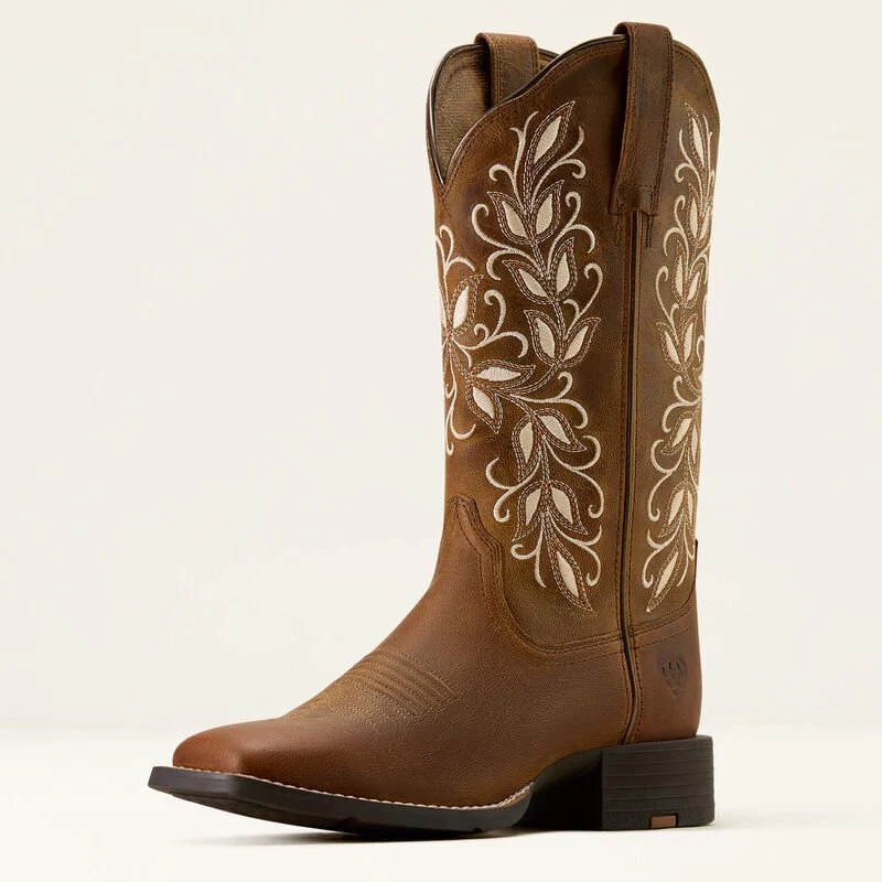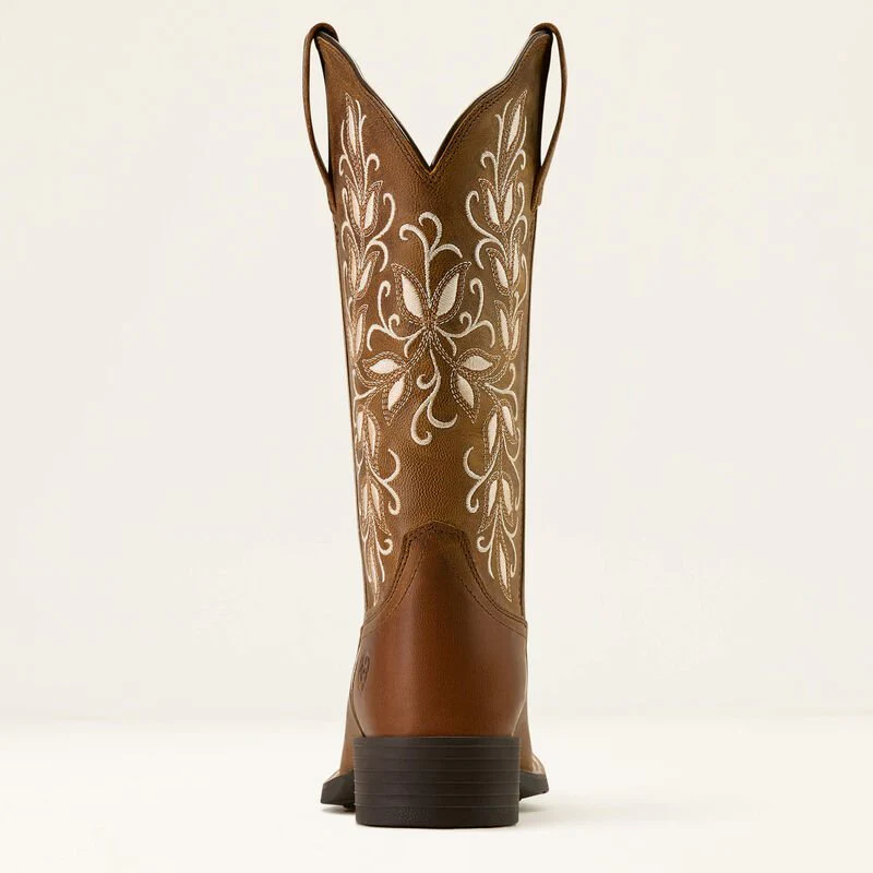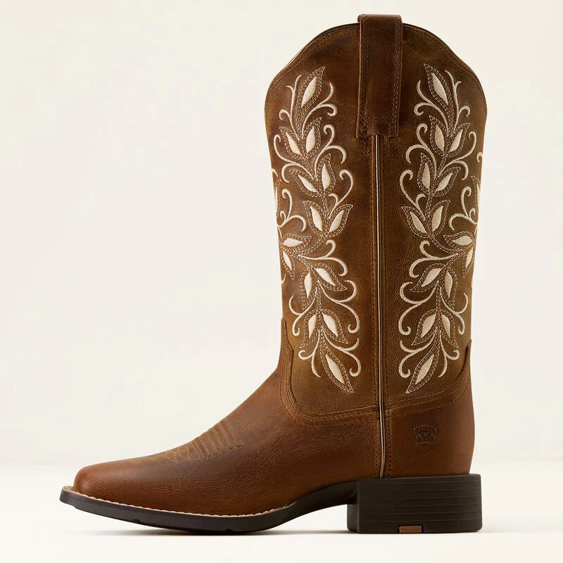 Kowbojki damskie Ariat Round Up Holly Wide to element garderoby w stylu western, który sprawdzi się zarówno na meczu, jak i na festynie. Piękne, przypominające winorośl przeszycia dodają odrobinę romantyzmu, a klasyczny krój emanuje urokiem kowbojki.