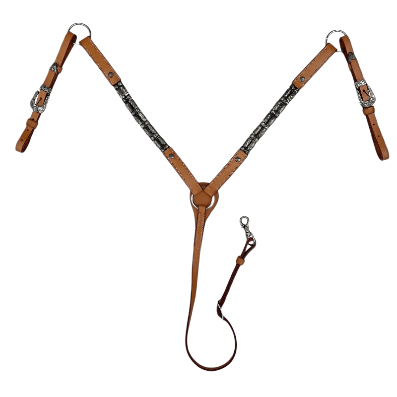 Napierśnik skórzany western to element rzędu zaprojektowany z myślą o stabilizacji siodła oraz komforcie pracy konia. Dzięki swojej konstrukcji w kształcie litery „Y” skutecznie zapobiega przesuwaniu się siodła, szczególnie podczas intensywnego użytkowania w terenie czy treningach sportowych. Wykonany z wysokiej jakości skóry łączy trwałość z eleganckim wyglądem. Regulowane paski pozwalają na precyzyjne dopasowanie do sylwetki konia.