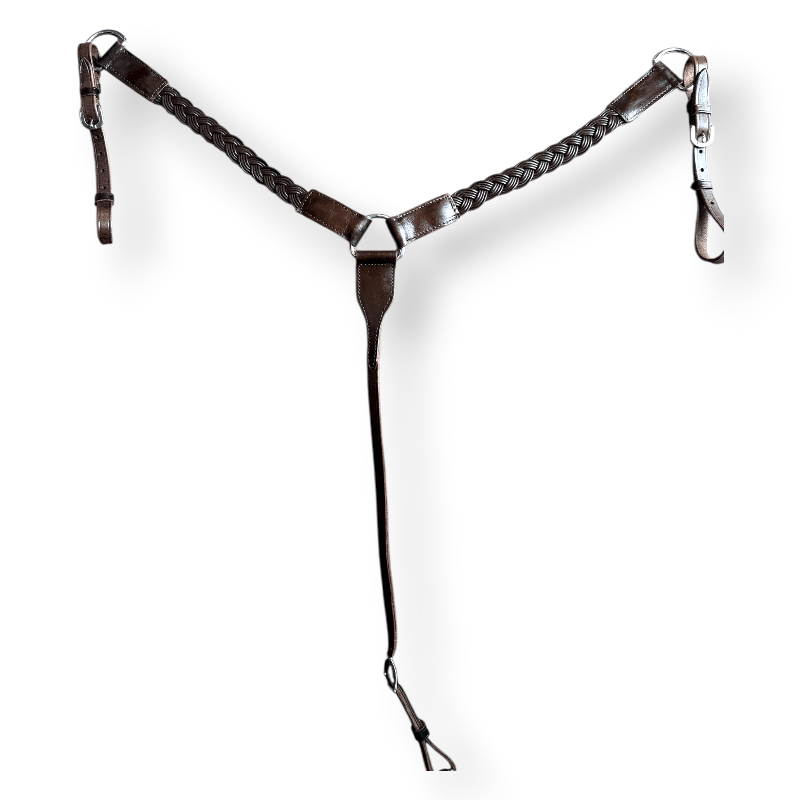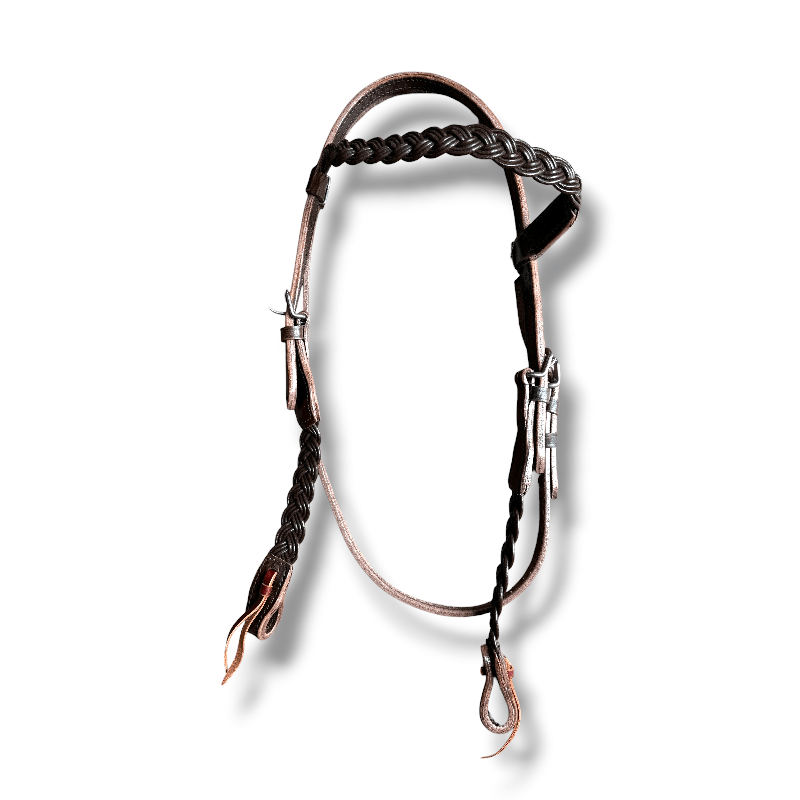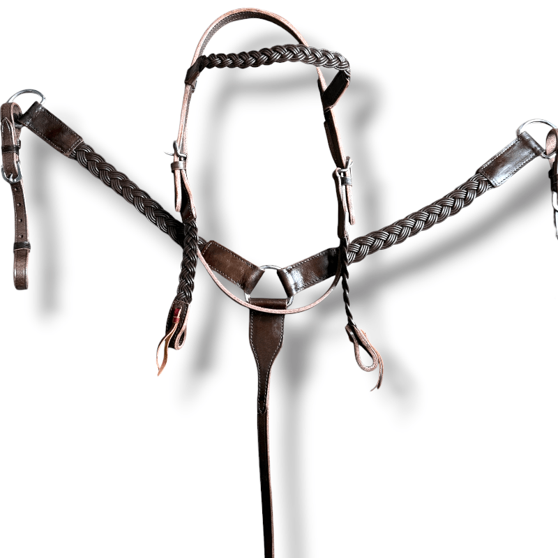 Ogłowie i napierśnik braided to solidnie wykonany zestaw western obejmujący ogłowie oraz napierśnik w ciemnym odcieniu. Ogłowie wyróżnia się starannie splecioną skórą na paskach policzkowych i naczółku oraz plecionym napierśnikiem, który dodaje całości klasycznego kowbojskiego charakteru.